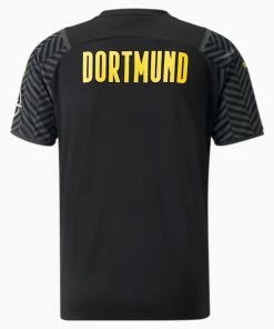 <p>Still featuring the iconic yellow and black colour scheme, this Borussia Dortmund away jersey is as stylish as it is practical. The left chest features the official club logo, there’s the eye-catching contrasted bonded cuffs on both sleeves and, of course, the PUMA Cat Logo on the front and sleeves. This is what every fan should be wearing, on the pitch or off.</p><h3> FEATURES & BENEFITS </h3><ul><li>Contains Recycled Material: Made with recycled fibers. One of PUMA’s answers to reduce our environmental impact.</li></ul><h3> DETAILS </h3><ul><li>V-neck with ribbed construction at back and shell fabric on front</li><li>Raglan sleeve construction with mesh shoulder panel</li><li>Contrasted bonded cuff on both sleeves</li><li>Official Borussia Dortmund 09 logo on left chest</li><li>PUMA Cat Logo on front centre chest and both sleeves</li></ul>